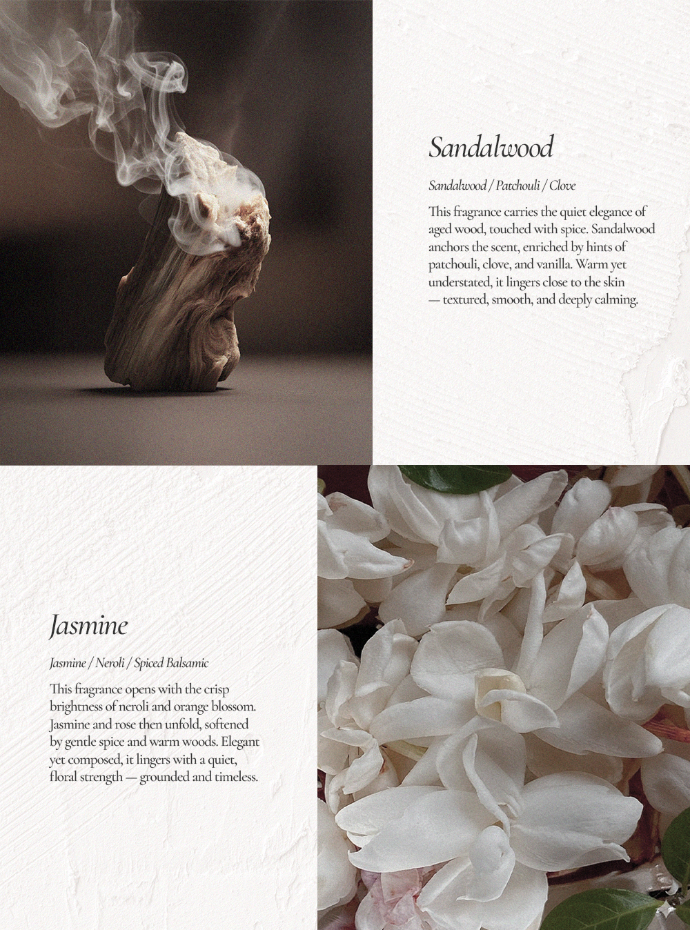 This fragrance carries the quiet elegance of aged wood, touched with spice. Sandalwood anchors the scent, enriched by hints of patchouli, clove, and vanilla. Warm yet understated, it lingers close to the skin — textured, smooth, and deeply calming.